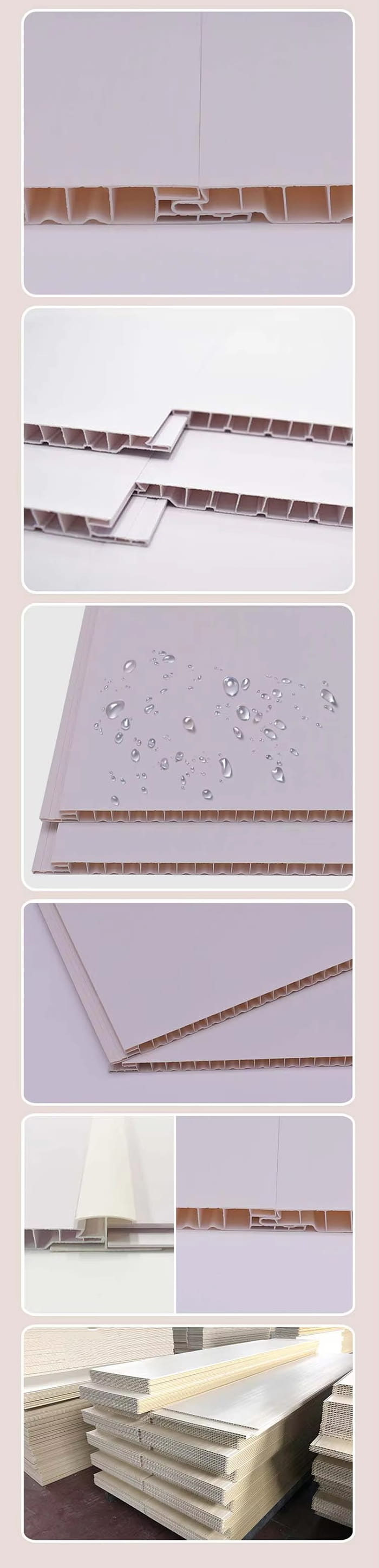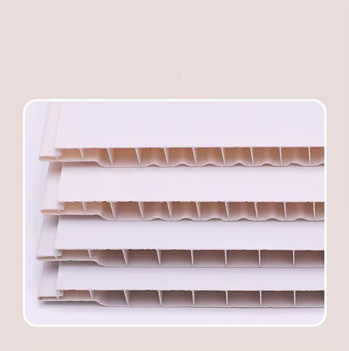 Le plafond en PVC est un matériau décoratif composé de résine de polychlorure de vinyle (PVC) comme matière première principale, de poudre de carbonate de calcium et de stabilisant sont ajoutés, et il est composé par un processus à haute température et haute pression. La surface adopte une technologie d'impression, de transfert ou de stratification, qui peut simuler diverses textures telles que le grain du bois et le grain de la pierre, et présente les caractéristiques d'imperméabilité à l'eau et à l'humidité, ignifuge, légère et haute résistance. Il convient aux scènes très humides ou aux exigences décoratives élevées telles que les cuisines, les salles de bains, les hôpitaux et les espaces commerciaux, et constitue un substitut idéal aux plaques de plâtre traditionnelles et aux goussets en aluminium.